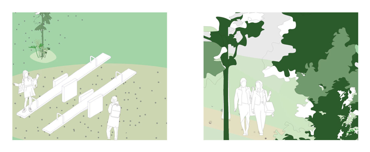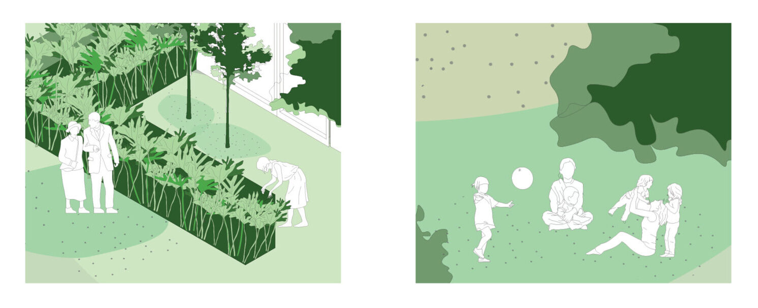 The concept of centralised domestic car parks (a multi-level car park, under or above ground) presents a plethora of potential design-led directions. Designed to serve individual blocks within a zone of influence, the parking structures have the potential to provide additional amenity for the community, through becoming mixed-use developments with integrated community functions. A successful example of this is Park ‘n’ Play by Ja Ja Architects, located in Copenhagen, Denmark. Designed to take a monofunctional building and make it multifunctional, the addition of a rooftop playground, as well as a green façade with integrated artwork, creates an inviting space for the community to use. There are multiple options for how these carparks can be used beyond vehicle storage. They can become flexible spaces for community use, including multifunctional indoor and outdoor areas for celebrations, markets, workshops, retail, gardens, food, exercise, and childcare. Imagine picking the kids up from school, parking the car, grabbing a coffee and heading to a safe rooftop play area, where everyone can connect with neighbours and friends. Amenities such as charging stations, bicycle repair shops, and shared interest spaces, build connections and develop activation throughout these suburban realms, setting up opportunities for social cohesion. These carparks can even be designed to be future proofed for adaptive reuse, either transforming into residential or commercial spaces, or extending vertically to include more properties. Shared centralised infrastructure such as solar energy generation, rainwater collection for use on site and storage can also be included.